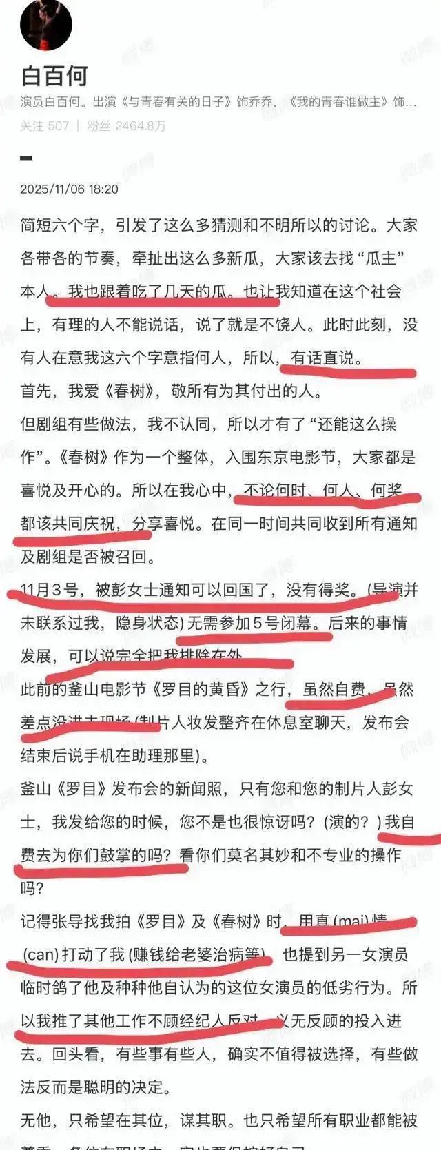 当颁奖礼结果揭晓那刻,所有猜测都变成现实魔幻主义——戏份吃重的女主颗粒无收,配角演员逆袭封帝。这剧情连《甄嬛传》编剧都不敢写,偏偏在现实世界上演。那些原本等着喝庆功酒的粉丝瞬间炸锅,有人把评审团照片P成"选择性失明"表情包,有人开始深扒王传君是不是救过评委会主席的命,舆论场秒变修罗场。就在舆论快要失控时,白百何那份手写长文像颗催泪弹砸来。原来光鲜亮丽的国际电影节背后,藏着这么多不为人知的辛酸。最让人破防的是她透露当初接戏时的情况——导演抱着剧本三顾茅庐,说着说着就开始抹眼泪,而她已经签好某S+级商业片合约。这抉择堪比高考志愿填报现场:选稳稳当当的985还是搏一把艺术梦想?